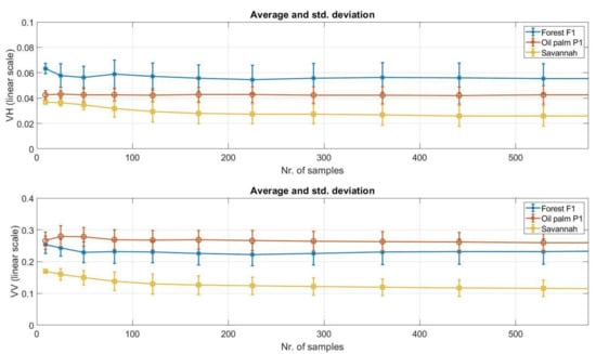Our results exhibit stability in both their mean and standard deviation values after a few tens of samples, except for the savannah area where a higher variability is exhibited (as discussed above) as a consequence of the heterogeneous scenario made up by grasslands and isolated trees. On the contrary, the highest variation for forests and oil palm plantations is limited to a 0.4–0.5 dB interval at most (for forest) up to the first 49 samples (i.e., a 7 × 7 window), which remains inside the standard deviation margins. In any case, even though a 9 × 9 boxcar filtering produces maps with a reduced speckle but still preserving the spatial resolution (as shown in Figure 8), the estimation of mean backscatter in this scenario would require averaging a higher total number of samples, for example 25 × 25, to further reduce speckle effect. To cite a previous example, authors in [8] first employed a temporal filtering [33] followed by a 23 × 23 boxcar filter. The variation of these statistics deserves further investigation for this application as it provides relevant information in terms of the trade-off between speckle reduction and spatial resolution degradation which is of importance for the generation of classification maps.