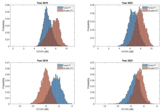 The VV–VH difference is another potential candidate for oil palm and forest discrimination (and other plantation types), as suggested in [10]. We obtained the VV–VH histograms for the F1 forest and P1 oil palm polygons in order to provide a first visual comparison with the VV/VH ratio. Figure 16 shows the results for the 2015 and 2021 acquisitions for the wet season. According to our previous analysis on the scattering signatures, the oil palm polygon in 2015 contained not only zones with low, recently planted, plants but also bare surface areas, as shown in Figure 4, where the maximum for the VH channel is found at −15.6 dB. Therefore, VV/VH appears to correctly separate both classes, but this is only a consequence of a dominant scattering from ground with some low vegetation on the surface. As shown for 2021, both histograms get closer due to a decreasing trend in VH backscattering initiated three years before for the oil palm P1 area (see Figure 7). Regarding the VV–VH difference, a similar separability is found in 2015 at early growth stages, whereas, for 2021, a higher overlap between histograms is clearly visible.