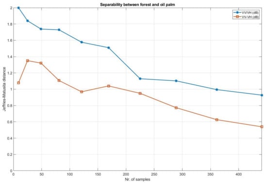 To illustrate the statistical performance of radar patterns, we computed the Jeffries–Matusita (JM) distance [27] for the last image acquired in 2021 where the oil palm has grown for six years. This is a measure of the dissimilarity of two distributions since it considers both the distance between class mean values and the distribution around the respective means.