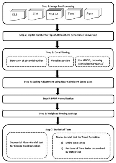 General flowchart for change point detection of PICS. VZA is the View Zenith Angle; BRDF is Bidirectional Reflectance Distribution Function; SQMK is Sequential Mann–Kendall.