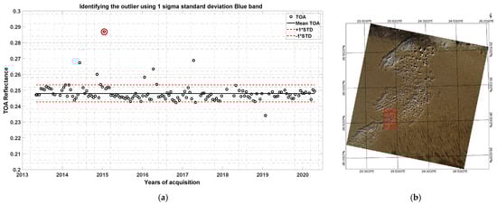 After calculation of the cosine corrected mean TOA reflectance value for the Region of Interest (ROI) of each image, filtering was required to obtain cloud and cloud shadow-free imagery. A quality assessment band is included with Landsat Level-1 data products in which each pixel in the Quality Assessment band consists of a decimal value, which represents bit-packed combinations of sensor, atmosphere, and surface conditions. Thus, the quality assessment band data can be used to filter out the cloud-contaminated pixels from ETM+ and OLI imagery. The pixel value of 672 (clear pixels) of the quality assessment band was used to form a cloud binary mask for removing cloudy pixels from ETM+ imagery and a pixel value of 2720 for OLI imagery []. Likewise, for Sentinel, cloud mask data from a cloud mask file was used to remove the cloudy pixels for all the bands with different spatial resolutions. Some outliers remained in the dataset even after applying the cloud mask using the quality assessment band and the cloud mask data. Thereby, an empirical sigma (σ) filtering approach was used for identifying outliers. Basically, a scene was considered a potential outlier when the mean TOA reflectance value of the scene exceeds one sigma (± 1σ) threshold. Subsequently, a visual inspection was carried out for the images that were considered as a potential outlier. When cloud, cloud shadow, or other artifacts were identified during the visual inspection of the image within the ROI for any spectral band of an image, the entire scene was discarded from the analysis. Figure 2 illustrates a potential identified outlier and the image corresponding to the point highlighted by the red circle. As can be seen, the red rectangle represents the ROI on the image, and it contains clouds, therefore this image was discarded from the analysis.