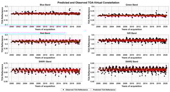 In red, the TOA reflectance predicted by the BRDF model; and in black, the observed TOA reflectance data of virtual constellation over Sudan 1 for blue, green, red, NIR, SWIR 1, and SWIR 2 bands.