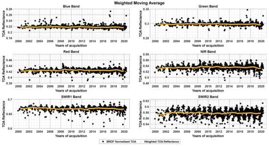 Intrinsic in the TOA reflectance data collected over time is some form of random variation. Smoothing (or averaging) is a technique applied to time series to reduce the effect caused due to random variation in the data. The idea is to remove the noise from the data and expose the signal to the underlying trend, seasonal and cyclical components in the time series. There are several smoothing techniques, which involve averaging methods and exponential smoothing methods. Simple averaging and averaging by weights fall under averaging methods, where simple averaging implies taking the average of the observations and averaging by weights implies assigning equal or unequal weights to all the observations and then averaging them. In this work, weighted moving averages were applied, with the weights based on each observation’s uncertainty. Non-parametric statistical analyses were applied to the resulting smoothed series [].