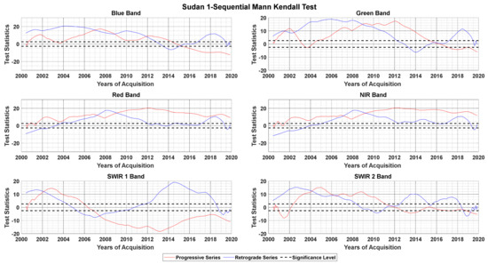 The results of the sequential Mann–Kendall (SQMK) test statistic for the virtual constellation weighted averaged TOA reflectance dataset of Sudan 1 reveal a statistically significant change point. The yearly plots for the progressive series and retrograde series ) for each band are shown in Figure 6. The level of significance was set to 99% (i.e., critical value ±2.58). For the blue band, the progressive and the retrograde series intersect four times throughout the time series indicating an abrupt change in the years 2007, 2009, 2011, and 2015. For the green band, the change points were detected in the year 2001, 2002, 2009 and 2015. Here, 2015 cannot be recognized as a significant change point as the associated probability value is lower than the accepted level of significance. For the red band, the progressive and the retrograde series cross each other twice in the years 2007 and 2009, indicating a significant turning point. The results for the NIR and red bands are identical. For the SWIR 1 band, the turning point was observed in the years 2002 and 2007. The SQMK result for the SWIR 2 band is also similar. The trend and change behavior of band pairs blue and green, red and NIR, and SWIR 1 and SWIR 2 are expected to be similar since their frequency range along the electromagnetic spectrum to acquire the data are close to each other. Table 7 summarizes change points detected by the SQMK test for all six spectral bands for Sudan 1 site.