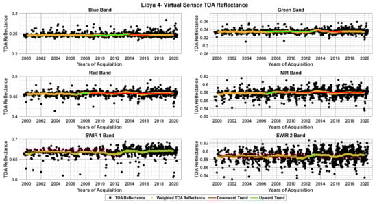 The MK test results applied to the sub-periods defined by the results of the SQMK test are shown in Figure 8. The figure shows the weighted averaged TOA reflectance dataset divided into sub-periods over Libya 4 for corresponding bands. These sub-periods are fitted with a significant trend line (α = 0.01) based on the MK test results both before and after the change points. Figure 8 depicts pronounced upward and downward trends occurring at different time periods throughout the entire time series. The MK test indicates a significant upward trend followed by a downward trend in the blue band, highlighting the actual change points in the years 2009, 2013, and 2018. The green band has a similar trend pattern as the blue band, but the upward trend starts one year earlier with the change points in the years 2008, 2013, and 2017. Although the slope of these trend lines is small (, the inflection points (where the function changes concavity) between these trend lines are statistically significant. The red and the NIR bands also indicate an upward trend and a downward trend with the inflection point in the year 2008 between these trend lines. The inflection points around the year 2012 for SWIR 1 and SWIR 2 can be seen with a downward trend before and upward trend after the inflection point. Table 9 summarizes the change points detected by the SQMK test for all the six spectral bands for the Libya 4 site.