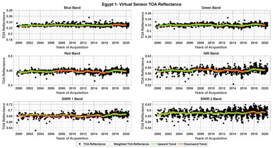 TOA reflectance data of the virtual constellation over Egypt 1 for blue, green, red, NIR, SWIR 1, and SWIR 2 bands with fitted trend lines before and after turning points.