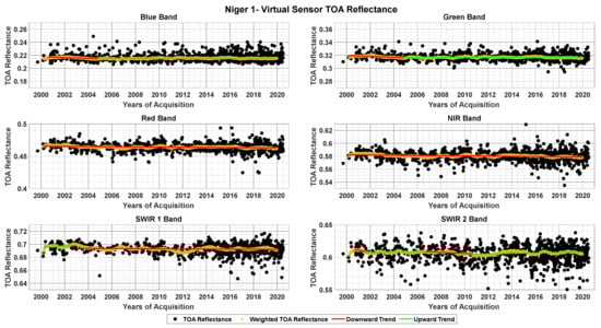 TOA reflectance data of the virtual constellation over Niger 1 for blue, green, red, NIR, SWIR 1, and SWIR 2 bands with fitted trend lines before and after turning points.