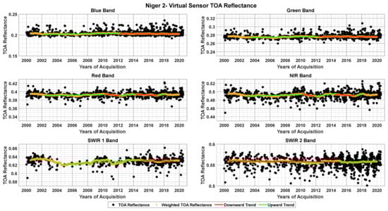 TOA reflectance data of the virtual constellation over Niger 2 for blue, green, red, NIR, SWIR 1, and SWIR 2 bands with fitted trend lines before and after turning points.