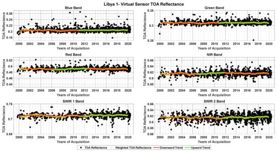 TOA reflectance data of the virtual constellation over Libya 1 for blue, green, red, NIR, SWIR 1, and SWIR 2 bands with fitted trend lines before and after turning points.