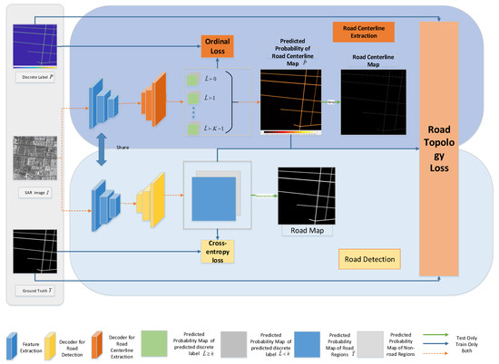 Figure 1 illustrates our road extraction framework. For road extraction, our proposed network learns the road detection task and the road centerline extraction task jointly under a multitask learning scheme. As shown in Figure 1, our framework has two branches: the road detection branch and the road centerline extraction branch. The encoder of the two branches is shared for feature extraction, which establishes a connection between the two branches. In this section, we first separately introduce how our network performs road detection tasks and road centerline extraction tasks. Next, the definition of our first proposed road-topology loss function is given. Finally, we introduced how our multitask learning framework simultaneously learns the road detection task and road centerline extraction task based on ordinal regression, using the road-topology loss that we first proposed.In the following discussion, we let be the input image, let be the corresponding ground truth, with 1 indicating pixels on the road and 0 indicating background pixels, and let be the predicted probability map of the road. We let the mini-batch be B, let i be a pixel in I, is label of pixel i. The predicted probability that pixel i is on the road is denoted by .