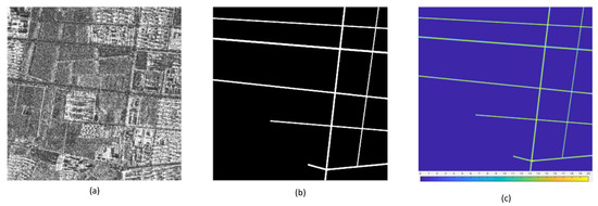 (a): SAR image. (b): ground truth of road. (c): ground truth of discrete label.
