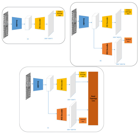 (a) baseline methods with only road detection branch; (b) the methods obtained by modifying baseline methods with road centerline extraction branch. (c) the methods obtained by modifying baseline methods with road centerline extraction branch androad-topology loss. ‘RD’ denotes the road detection; ‘RCE’ denotes the road centerline extraction.
