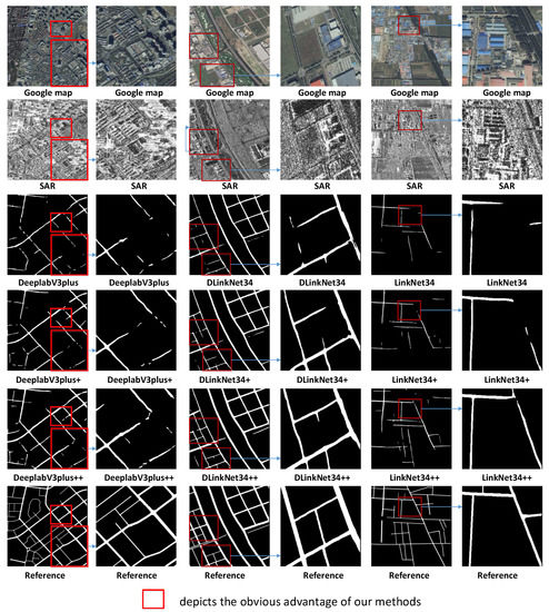 In this subsection, we first introduce the networks that are used as baseline methods in this paper. We choose three fully convolutional neural networks (FCNNs), including LinkNet34 [48], DLinkNet34 [49], and DeeplabV3plus [50] as baseline methods to study the performance of our method. These three networks were implemented to extract roads from optical remote sensing imagery. To adapt to the size of images in our dataset, we set the dilation rates of dilated conventional operations in DeeplabV3plus to . To verify that both the proposed multitask architecture and loss function are effective, we will perform three sets of comparative experiments. Each set of comparative experiments contains three methods, including the baseline method, the method I, the method II. As shown in Figure 4, (a) is the network architecture of the baseline method, while (b) and (c) are the network architectures of the method I and the method II, respectively, which both have two branches: road detection branch and road centerline extraction branch. The methods I in the three sets of comparative experiments are, respectively, abbreviated as LinkNet34+, DLinkNet34+, and DeeplabV3plus+, which are obtained by modifying the networks of the baseline methods with dual and identical decoders having shared encoders. The methods II in the three sets of comparative experiments are, respectively, abbreviated as LinkNet34++, DLinkNet34++, and DeeplabV3plus++, which use the road topology loss to update the network parameters and have the same network architecture as the methods I.