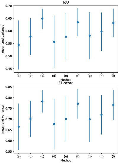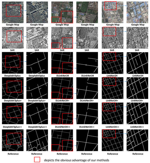 In this section, we will discuss the robustness of different methods when the binarization threshold is changed. When we set different binarization thresholds, the road detection results will be different. However, in practice, we do not know the optimal binarization threshold. Figure 8 reflects the statistical characteristics of IoU and F1 across different binarization thresholds. The IoU and F1-score results of baseline methods(LinkNet34, DLinkNet34, DeeplabV3plus) are unstable with the vary of the binarization thresholds, as evidenced by the large variance in IoU and F1. In contrast, the F1 and IoU of our methods show better stability. Figure 8 also reports that, for F1 and IoU metrics, the means of the baseline methods are less than our proposed methods’ means. This is due to the use of a multitask learning scheme that can make two tasks mutually promote each other, and a road-topology loss that is minimized to eliminate topology errors. In conclusion, our methods can achieve a high performance under a wider range of binarization thresholds than baseline methods.