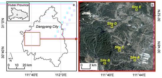 The study area is located in Dangyang City, Hubei Province (Figure 1a). Dangyang is situated in a mid-latitude area and experiences a subtropical monsoon humid climate, with rainy and hot weather occurring within the same season. The annual average temperature is 16.6 °C, and the average annual rainfall is approximately 990 mm. The study area consists of a hilly area with undulating terrain and fragmented land cover. The main forest type is mixed forests, in which the evergreen tree species are mainly masson pine (Pinus massoniana) and slash pine (Pinus elliottii), and the deciduous tree species are mainly sawtooth oak (Quercus acutissima) and cork oak (Quercus variabilis). The main soil type is the yellow brown soil.