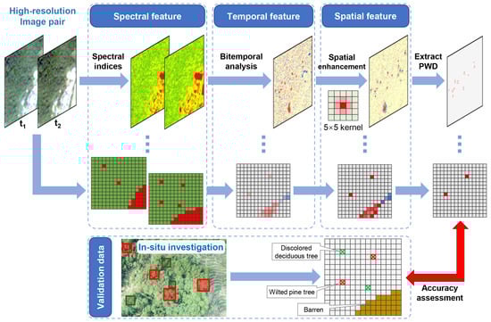 In this study, we proposed a new perspective based on spatiotemporal change detection for the tree-scale PWD detection in a complex landscape with mixed forest and fragmented land cover. The approach captured spatial and temporal patterns of the PWD-induced wilting through a bi-temporal analysis and a spatial enhancement. The results showed that the proposed method can effectively distinguish wilted pine trees from discolored deciduous trees, sparsely vegetated regions, and many other objects with which they are easily confused. The user’s accuracies for the proposed method were significantly higher (81.2%) than those for the single-date classification (67.7%). By not limiting ourselves to a specific method, we are more focused on proposing a spatiotemporal feature extraction strategy that effectively address targets that cannot be distinguished solely by spectral information, with a goal toward advancing research on remote sensing monitoring of forest pests and diseases.