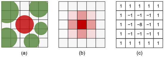 A typical spatial pattern of the wilted pine trees in the images were abstracted based on the average canopy width, which is approximately twice the size of the pixel (Figure 4). In the imaging process, radiation naturally reflected from the ground are sampled and quantized into digital numbers (DNs) within the grid cells. The spacing between pixels on the canopy was shown in Figure 4a. In general, the values of the wilted pine tree are negative and significantly lower than those of the surrounding healthy trees, which is close to 0. Within a wilted pine tree, the values of the canopy centroid are lower than those at the edge of the canopy (Figure 4b). Therefore, we defined a measure of the spatial similarity of an image patch to a wilted pine tree using the spatial convolution with a 5 × 5 kernel (Figure 4c). The kernel was then normalized to sum to 1, and the image was convolved with the normalized kernel. Let be the output of the spatial convolution from the input image.