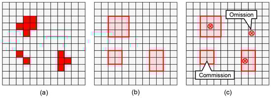 Schematics showing (a) the wilted pine tree pixels masked by the threshold , (b) the candidate bounding boxes (s) converted from the pixel-based result, and (c) the omission and commission errors defined based on the locations of wilted pine trees and s.