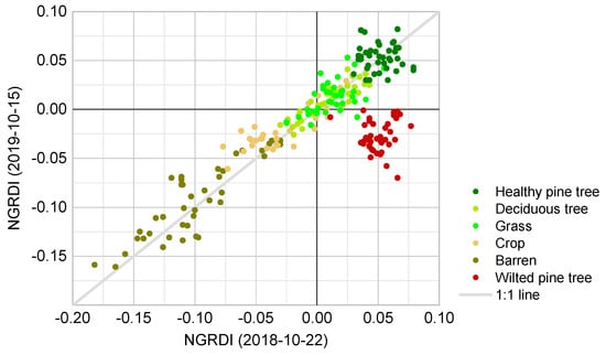 The NGRDI observations in 2018 and 2019 for six typical cover types, including wilted pine tree caused by PWD in 2019 as well as healthy pine tree, deciduous tree, grass, crop, and barren, were used to construct a scatter plot (Figure 6). A total of 300 pixels (50 pixels per cover type) were randomly selected from the sample set. In general, the NGRDI observations is correlated with the coverage of green vegetation as well as the color of the canopy. Pixels of healthy pine trees have higher NGRDI observations, while barren areas have the lowest NGRDI observations. The NGRDI observations of deciduous trees, grass, and crops are distributed around 0, with positive and negative values. In addition, the NGRDI observations for 2018 and 2019 were very close if there was no land (or surface) cover change, while those for pine trees infected with PWD in 2019 clearly deviated from the 1:1 line, mostly falling in the fourth quadrant of the coordinate system.