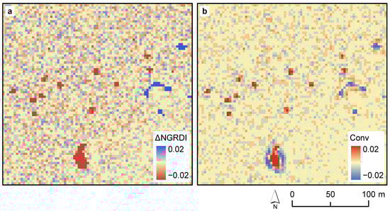 where and are the reflectance of the red and green bands, respectively. The NGRDI observations are correlated with green vegetation cover with the possible range from −1 to 1. In this study, the NGRDI was employed to indicate the color of a pixel (i.e., greenish or reddish). Then, a differentiation was made between the NGRDIs from the two dates:
