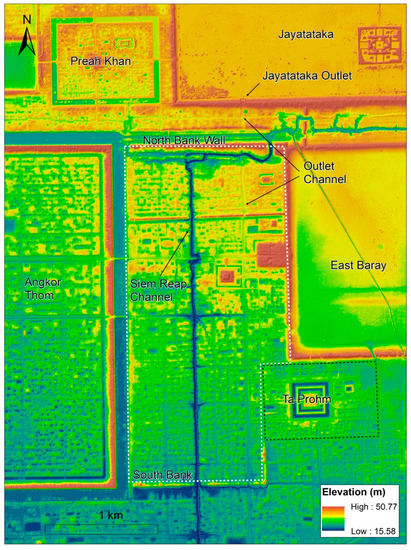 Despite the general spatial characteristics of the North Bank Wall and the South Bank being identified in the 1930s, the functional relationship between the two was forgotten and only became apparent through the lidar-based digital terrain model (DTM) made available by KALC in 2012 []. The lidar DTM verifies Trouvé’s survey showing the full extent of the inner part of the South Bank connecting with Ta Prohm. The lidar also reveals another feature that Trouvé had identified, but only in part—the Jayatataka Outlet channel. This channel connects with the North Bank Wall’s moat and continues for several kilometers to the south.