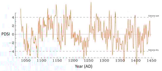 Pacific Drought Severity Index (PDSI) showing monsoon strength over time, derived from dendrochronology records (Adapted with permission from ref. []. Copyright 2014 Quarternary Science Reviews).