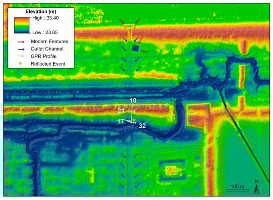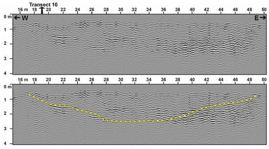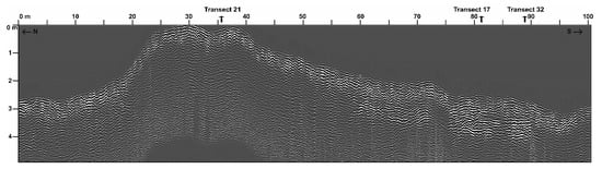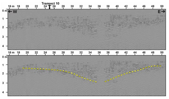 A few meters south, in the same direction, Transect 32 presents a similar channel-like feature with approximately the same size, shape, and depth as seen in Transect 17. Both are approximately 30 m wide, with a depth of more than 2 m, filled with layered and convoluted depositions and they align perfectly on the N–S axis (Figure 4). Throughout most of Transect 17, a “V” shaped interface reflects from around 50 cm from the surface up to 2.6 m in depth at its lowest point. This feature is filled with complicated stratigraphy with many horizontally discrete reflectors and an attenuated area can be seen as a disruption at the lowest point of the feature.