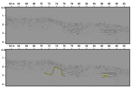 Transect 10 running N–S shows the most signal attenuation (Figure 5) on the highest part of the embankment with noticeable changes on the slopes, markedly at the South slope. As we look at the top of the embankment in more detail (Figure 6), with the Hilbert transform applied to the migrated data, some large reflection areas close to the surface presenting a somewhat regular spacing can be seen throughout the highest region. The reflections after the Hilbert transform can better represent the structures in the subsurface for the oscillating elements of the radar pulse are now represented by the envelope of the trace []. In any event, the radar energy does not penetrate much further than this layer, which is similar to the results of a survey at Koh Ker [,]. Following the transect South, through the more moderate slope, the reflectors near the surface become smaller, more irregularly spaced, and signal penetration improves. Although, around meter 74, another acute attenuation occurs (dashed line Figure 7) with layered deposition on both sides of the attenuated area. To the south side, a striking layered deposition presents a polarity inversion between the layers (arrow on Figure 7). Transect 21, perpendicular to transect 10 and parallel to the embankment, presents the same low penetration and shallow reflectors. As the slope tends to flatten near the base of the embankment, penetration improves and an interface can be seen on Transects 17 and 32 (Figure 8 and Figure 9) that is also parallel to the embankment.