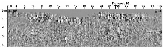 From the eight collected transects at the North Bank Wall, four (Transect 10, running N–S, and transects 17, 21, and 32 running E–W) presented relevant data to assess the structure of the embankment and its surroundings (see Supplementary Materials). The other transects suffered too much decoupling due to the rough terrain to be useful for defining stratigraphic features. In general, signal penetration varied from one to three meters in depth, calculated based on a RDP of 12.7 for all transects. Variations in penetration are caused by attenuation or loss of signal and can have multiple causes.