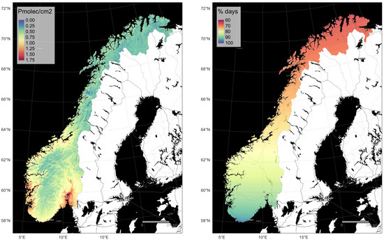 Spatial patterns of tropospheric column from TROPOMI over Norway (in units of ×1015 molecules cm−2 ), averaged over the entire study period between July 2018 and November 2020 (left panel) and the proportion of days where the noon solar zenith angle is less than 81.2°, i.e., the solar zenith angle treshold above which no valid retrievals with a quality assurance value of 0.75 can be made [9,10], thus providing an upper constraint for the theoretically possible number of days with valid retrievals at this quality threshold under clear-sky conditions (right panel, see Section 2.2 for more details).