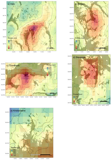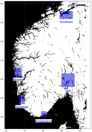 The five largest urban areas in the southern part of Norway were selected as study sites. This includes the capital city of Oslo with a population of approximately 1.5 million inhabitants in the entire metropolitan area, the greater Bergen region (420,000 inhabitants), the region of greater Stavanger and Sandnes (ca. 320,000 inhabitants), the greater Trondheim region (ca. 280,000 inhabitants), and the greater Kristiansand region (ca. 155,000 inhabitants). Figure 2 shows the location and the extent of the domains of the study sites in a geographical context. In addition, Table 1 shows details of the selected study areas.