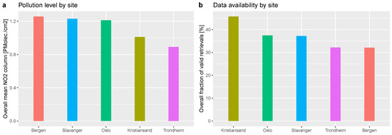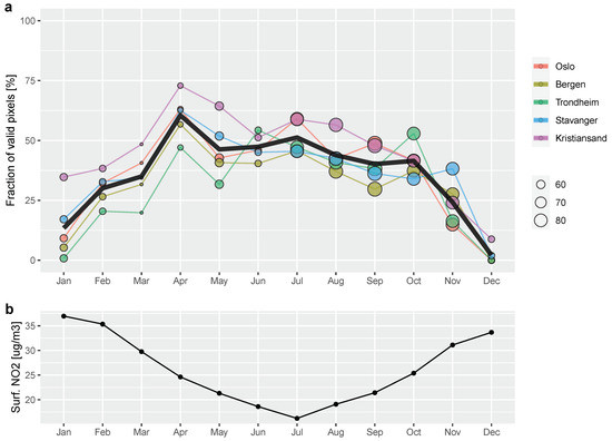 Satellite data provided by the latest generation of earth observation satellites such as Sentinel-5 Precursor (S5P) with its TROPOspheric Monitoring Instrument (TROPOMI) allow for unprecedented opportunities to monitor air quality [1] and particularly, nitrogen dioxide () pollution at global, regional, and even local scales [2,3,4,5,6]. In particular, the relatively fine spatial resolution of the instrument, in contrast to previous such instruments, offers for the first time the potential for monitoring air quality even at urban scales [7]. It is therefore conceivable to use such data for monitoring urban-scale air quality as well as exploiting them for improving the output from urban scale dispersion models [8]. At this point, however, it is unclear to what extent such data can realistically be used in conjunction with local-scale dispersion models, particularly in often cloudy high-latitude regions such as Norway, where data availability can be a challenge. For this reason we study here the spatiotemporal patterns in data availability of useful, i.e., valid, high-quality, and cloud-free TROPOMI observations of over the largest urban areas in Norway.