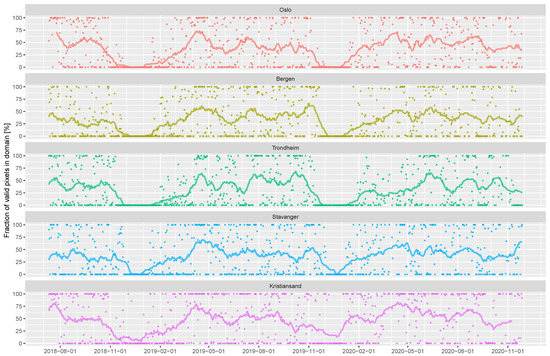 In addition to an analysis of the spatial patterns of pixel validity, we carried out an analysis of the temporal patterns. Figure 6 shows the time series of the fraction of pixels that are valid for each domain and for each day. We can observe significant variability throughout the year with the highest amount of 100% values valid in the summer months and typically several week long periods of 0% days in December and January. The length of the winterly period with no data has a slight dependence on latitude (shortest in the more southerly Kristiansand, longest in the more northerly Trondheim) suggesting that in addition to cloud cover, low light levels (i.e., very high solar zenith angles) around the winter solstice do play a substantial role in data availability.