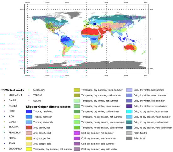 A map with the locations of the ISMN soil moisture monitoring sites that the study uses. The Köppen-Geiger climate classification [44] background map shows the global distribution of climate zones.