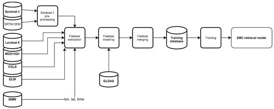 The study presented hereafter followed a similar approach to that of Pasolli et al. [30], who used in situ SMC measurements as a target variable for the ML algorithm and the construction of an empirical model. One of the novel aspects of this work is to propose a data-driven approach that can be applied regardless of location, to be globally applicable but locally relevant. Instead of focusing on a specific study region like in previous studies, the model was trained and tested on the International Soil Moisture Network (ISMN), with global coverage. Chatterjee et al. followed a similar aim with the work presented in [38]. They introduced an approach to training a model for SMC estimations within the entire continental United States of America using US Climate Reference Network (USCRN) measurements as a training target. Some limitations described in [40] were related to the lack of accurate auxiliary data (e.g., land cover, soil type). The article presented here demonstrates how some of these limitations can be overcome by (1) further increasing the size of the training dataset using measurements from the International Soil Moisture Network (ISMN) and (2) combining Sentinel-1 SAR data with optical data from Landsat-8. It shows how ML can be applied in a data-driven approach to estimate high-resolution SMC based on a spatially dispersed training dataset. The proposed solution tackles a gap of the currently available operational datasets regarding their spatial resolutions. Existing operational satellite-based soil moisture products focus on the mapping at medium to coarse spatial resolutions [14,15,16,17]. Furthermore, one of the study outputs is a software toolbox allowing the fully cloud-based mapping of the SMC, enabling easy access for data users and integration in other studies.
