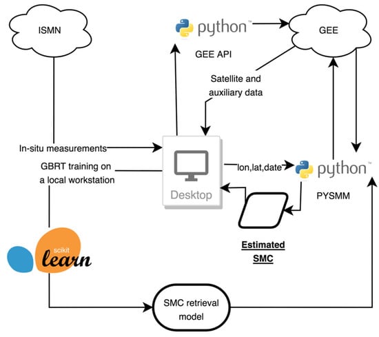 For the training, ISMN data were prefiltered, downloaded and stored locally. Based on the in situ locations (in space and time), the S1, L8, GLDAS and other auxiliary data were retrieved from GEE using the Python API. All preprocessing and filtering steps were carried out server-side, i.e., only the filtered and preprocessed training data were downloaded to the local workstation. Scikit-learn [86] was used to solve the regression problem and derive the GBRT model. Figure 4 gives a schematic overview of the architecture. Depending on the number of training samples, the training procedure can be time-consuming, mainly due to GEE’s data retrieval. The GEE based mapping of SMC was implemented as a stand-alone Python package, the PYthon Sentinel-1 Soil-Moisture Mapping Toolbox (PYSMM) [88]. PYSMM is freely available as open-source software and was delivered as Supplementary Material to this article.
