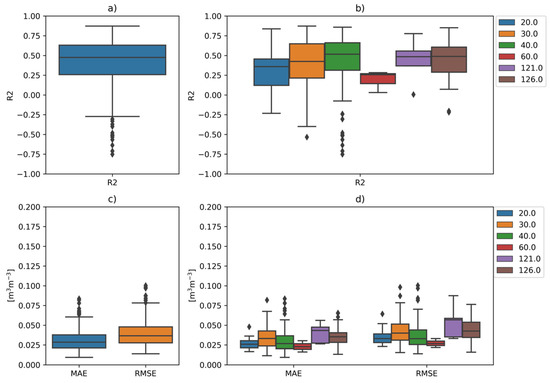 Boxplot summarizing the sensitivity of predicted SMC to temporal dynamics: (a) temporal R2, averaged over all locations in the test set; (b) temporal R2, averaged over groups of locations belonging to the same land-cover class; (c) average accuracy over all locations contained in the test set in terms of MAE and RMSE; (d) average accuracy in terms of MAE and RMSE grouped by land-cover class.