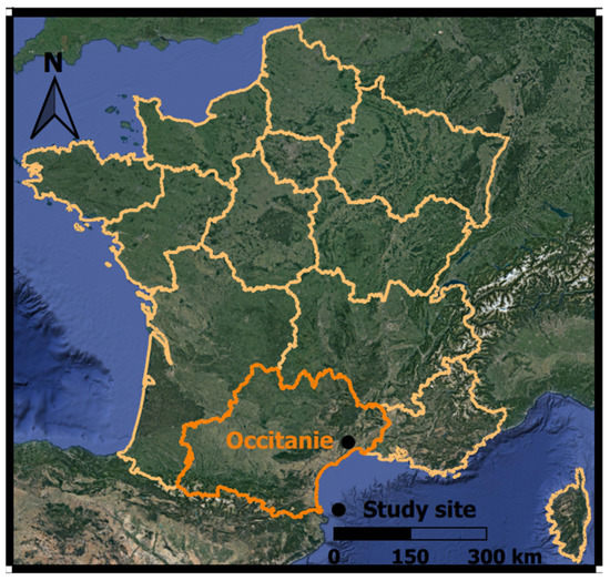 The study area is located in the Southeast of France, over the Occitanie region (centered on 3.80° E and 43.67° N) (Figure 1). The site is characterized by a flat terrain composed of forests, vineyards and agricultural areas. The area is known for its Mediterranean climate, with average air temperatures ranging from 3 °C to 29 °C and a rainy season occurrence between October and March. The recorded average cumulative rainfall is about 750 mm. Reference plots with only bare soils, characterized by a sandy loam soil texture [61], were selected to perform the experiment.