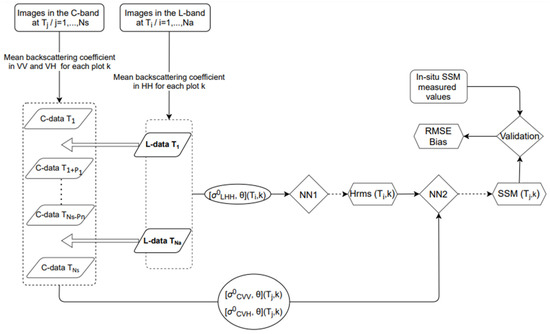In this study, the simulated σ0 in the C-VV, C-VH and L-HH were used in an inversion approach for SSM and/or Hrms estimation, using the neural networks (NNs) technique. Thus, the development of the inversion approach consists of five steps: