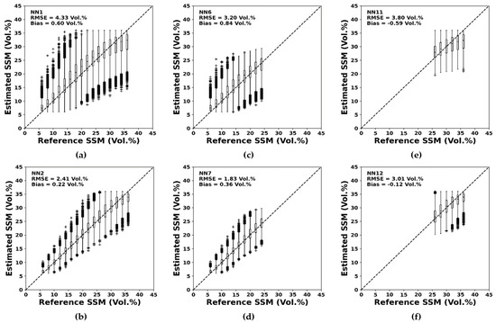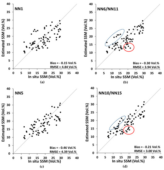 - In the case of no a priori information on SSM (NN1), the bias varies from −4.1 vol.% to 4.0 vol.% (Figure 4a).