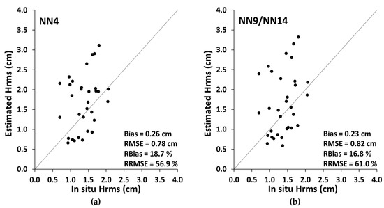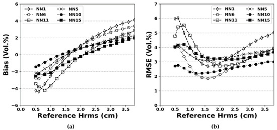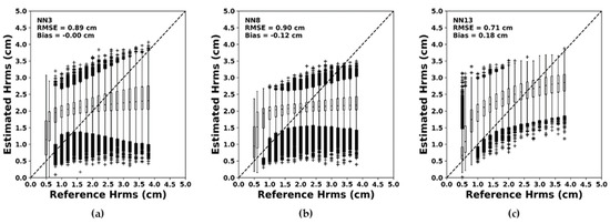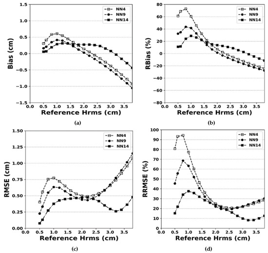 Furthermore, the evolution of the errors (i.e., bias and RMSE) was analyzed according to the reference Hrms values (Figure 4). For the NNs of the category 1 (NN1, NN6 and NN11) the results vary greatly as a function of the Hrms. As the reference Hrms increases from 0.5 to 3.8 cm: