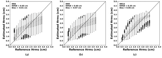 In addition, the relative bias (RBias %) was computed as the bias over the average of the reference Hrms values. Figure 7b shows the maximum values of RBias between 60% and 70% for NN4 and Hrms between 0.5 and 1 cm. For Hrms between 1.5 and 3.8 cm, RBias varies between −20% and 20%. In addition, for NN9 and NN14, RBias varies between −30% and 42% and between −10% and 28%, respectively. In conclusion, the use of a priori information on SSM leads to absolute RBias which does not exceed 30% for Hrms between 1.2 and 3.8 cm.