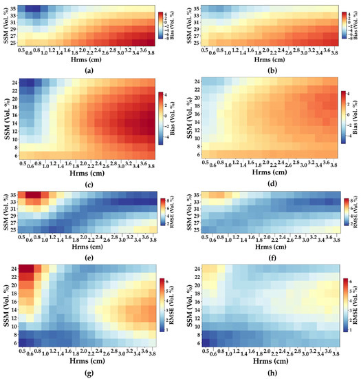 Bias (estimated SSM − reference SSM) and RMSE as a function of reference Hrms and SSM using simulated C-band data. (a,e) NN with a priori information on SSM for very wet soils without Hrms in input (NN11); (b,f) NN with a priori information on SSM for very wet soils with noisy Hrms in input (NN15); (c,g) NN with a priori information on SSM for dry to slightly wet soils without Hrms in input (NN6); (d,h) NN with a priori information on SSM for dry to slightly wet soils with noisy Hrms in input (NN10).