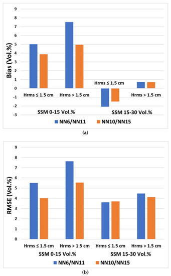 Figure 8 shows that the NN5 (without a priori information on SSM) and the NN10 (a priori information in dry to slightly wet soil conditions) underestimate the SSM for Hrms values lower than 1.5 cm. This underestimation is also observed using the NN15 (a priori information in very wet soil conditions) for Hrms <2 cm (Figure 8a). In fact, the bias is higher for low Hrms values (−2.3 vol.% with NN5 and −1.7 vol.% NN10 for Hrms = 0.5 cm). This underestimation was higher with NN1 and NN6 (neglecting the Hrms effect). In fact, for Hrms values lower than 1.5 cm, NN1 and NN6 underestimate the reference SSM with a maximum bias of about −4 vol.% (for Hrms = 0.5 cm). At Hrms values greater than 1.5 cm, the reference SSM is overestimated for the NNs without a priori information on SSM and for NNs with a priori information for dry to slightly wet soils (NN1, NN5, NN6, NN10) (Figure 8a). This overestimation increases as the Hrms values increase, with a higher error for the NNs that neglect the Hrms effect (NN1 and NN6). For SSM values greater than 25 vol.%, the NNs with a priori information on SSM, both NN11 (Hrms neglected) and NN15 (noisy Hrms in inputs), underestimate the SSM for Hrms values ranging between 0.5 and 2 cm. This underestimation is higher for NN11 and decreases when the Hrms increases. The bias varied between −4 and 2.7 vol.% for NN11 and between −2.3 and 2 vol.% for NN15 when the Hrms increased from 0.5 to 3.8 cm (Figure 8a).