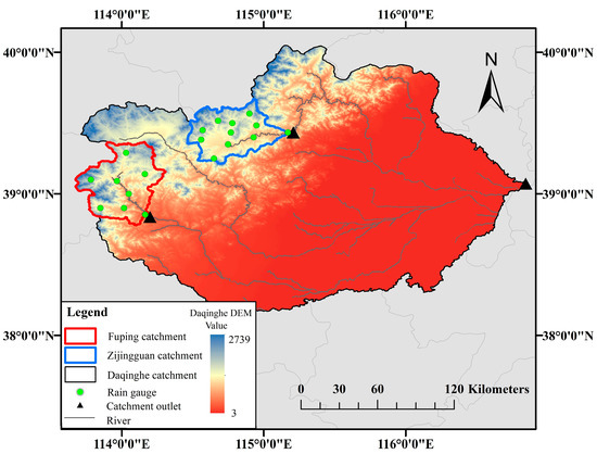 The main focus of this study is the Fuping and Zijingguan watershed covered by Domain 2 and Domain 3 of the WRF model. According to the temporal and spatial distribution characteristics of rainfall and the representatives of rainfall-runoff generation characteristics, the case used in this study is four 24-h rainstorm events, which occurred in Fuping and Zijingguan watershed. Fuping catchment is located at 39°22′N~38°47′N and 113°40′E~114°18′E with a drainage area of 2210 km2 and Zijingguan catchment is located at 39°13′~39°40′N and 114°28′~115°11′E with a drainage area of 1760 km2. They belong to the south and the north branch of the Daqinghe basin respectively, located in northern China, having a warm temperate continental monsoon climate. Terrain elevation of the study area varies from 2286 m in the northwest part to 200 m in the southeast mountains. The average annual rainfall in the study catchments is approximately 600 mm, the short episodes of intensive precipitation are more frequent in late May and early September. The steep terrain leads to a short confluence time of the flood, which together with high-intensity, short-duration precipitation is prone to cause severe flood disasters. They are concentrated in areas with thin soil layer and low vegetation coverage especially. In particular, on 21 July 2012, the 24 h rainstorm event occurred in the Beijing-Tianjin-Hebei region, which has been widely concerned because of the heavy rainfall intensity and large losses. The duration of the four storm events and the accumulative rainfall amounts are shown in Table 2. Among the four storms, event 4 is the heaviest one trigged by a severe convective system, concentrated in a small area of the watershed and with high rainfall intensity in a short time period. The other three storms are typical stratiform rains with moderate intensity but various distributions in space and time. The measured rainfall data are rainfall stations and the time interval is 1 h. The 24 h rainfall accumulation is computed by Thiessen polygon method, which averages the observations from the rain gauges. Figure 2 demonstrates a detailed map of the study area, such as the rain gauges, watershed boundary, catchment outlets topography, and major rivers.