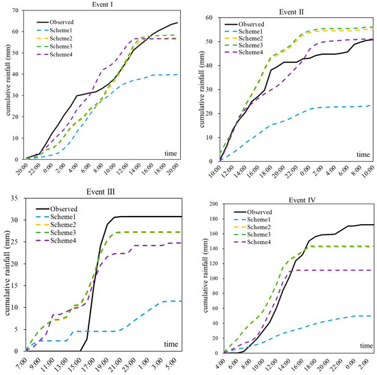 As can be seen from Figure 5, the radar precipitation estimation of Event I was closer to the observation accumulation curve, and at the same time, assimilation effect of Event I was also the best in all events. In addition, there was substantial rainfall growth during the first nine hours of the rainfall after the radar data assimilation for Event III, and the accumulated rainfall increased abruptly. Additionally, we found that the radar measures rainfall from the 1st hour to the 9th hour as much larger than the observed rainfall (Figure 5), as revealed in many previous studies [54]. Therefore, in our storm events selected, the accuracy of radar reflectivity is of primary importance in improving the quality of precipitation forecast within the time range of forecasting [5].