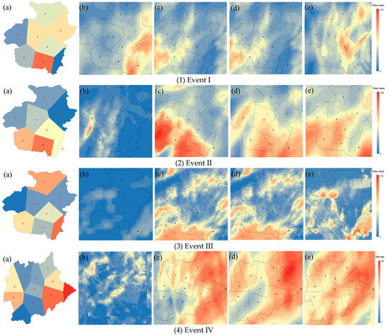 Spatial rainfall distributions of gauge observations and forecasts from four data assimilation schemes for Event I, II, III, IV, from left to right: (a) observation; (b) NA_1km; (c) DA_1h_1km; (d) DA_1h_3km; (e) DA_6h_3km.