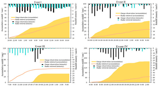 Observations and radar measurements of 24 h rainfall accumulations for Event I, II, III, IV.