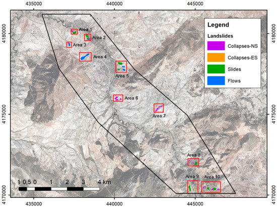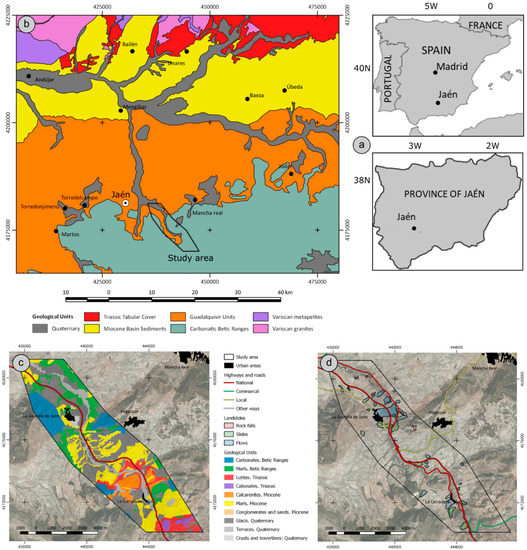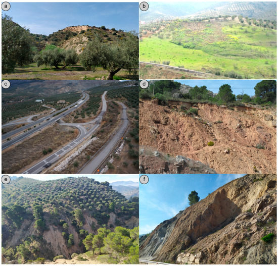 The study area of 51.4 km2 is located south of the city of Jaén, in the vicinity of the A-44 highway that connects it with Granada along the Guadalbullón river valley. The hillslopes, where the highway cuts are developed, have a moderate to high slope angle. There are numerous instability processes that usually correspond to slides and flows and even rock falls to a lesser extent [35,36,37], according to the Varnes classification [38,39] (Figure 1 and Figure 2).