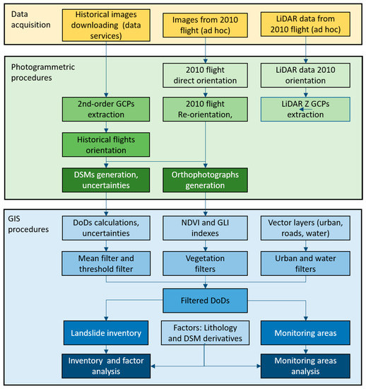Most of these studies, both photogrammetric and/or LiDAR approaches, are focused on single movements in unstable areas, although some of them are applied to detect landslides and elaborate inventories [13,26,28,29,30,31,33,34].